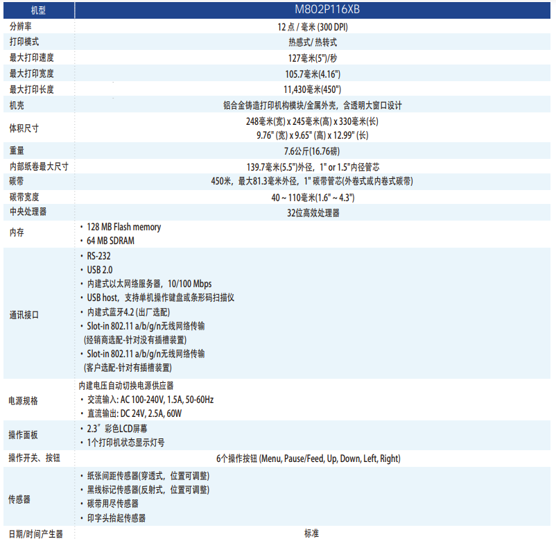 M802P116XB 工业型 热感式/热转式 条形码打印机产品参数:
