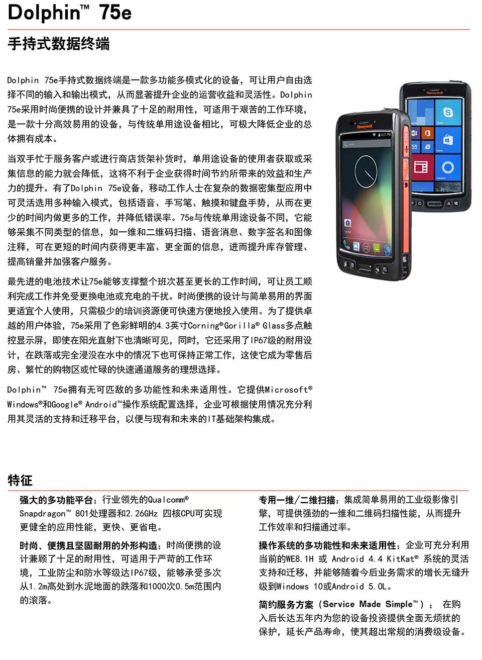 Dolphin75e手持式数据终端是一款多功能多模式的设备,让使用者能够自由选用各种输入和输出模式,可显著提升企业的运营收益和灵活性。Dolphin 75e采用时尚便携的设计兼顾了十足的耐用性,可适用于最严苛的工作环境,作为一款高效易用的设备,与传统单用途设备相比,它可为企业带来更低的总体拥有成本。